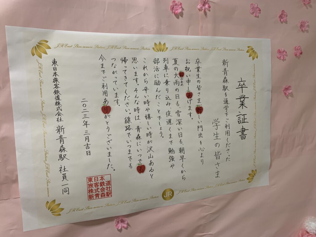 3月は卒業シーズンということもあり、故郷を離れる人も多い月です。新青森駅にも駅員さんからの手紙が飾っており、ほっこりした気持ちになりました。