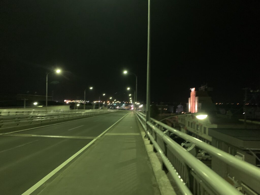 新青森駅を背に、北へと歩みを進めます。暗闇の中、街灯がぽつりぽつりと光を投げかけ、街路を静かに照らし出します。道を進むと、目の前に現れるのは大きな橋。その橋の下には、JR津軽線と、車両基地へと向かう鉄路が伸びています。深夜の時間帯とあって、街は静まり返り、電車が通る音さえも、まるで遠い世界の出来事のように感じられます。静寂の中に微かに響く鉄の音が、旅の始まりを告げているかのようです。