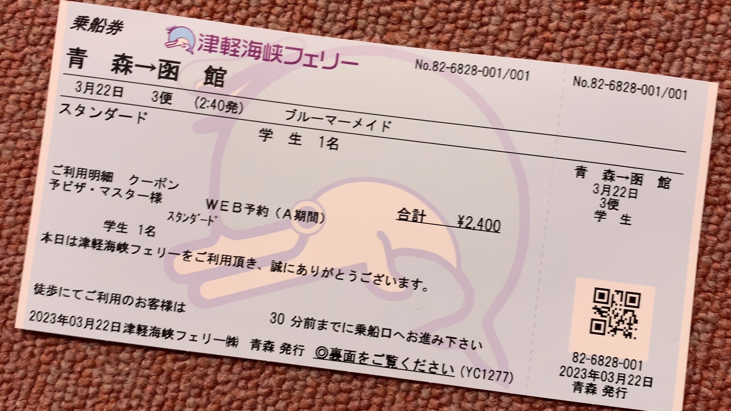 ターミナルで乗船手続きを済ませ、「スタンダード」の乗船券を手にしました。学生割引を利用して、2,400円とさらにお得に函館へ向かうことができます。