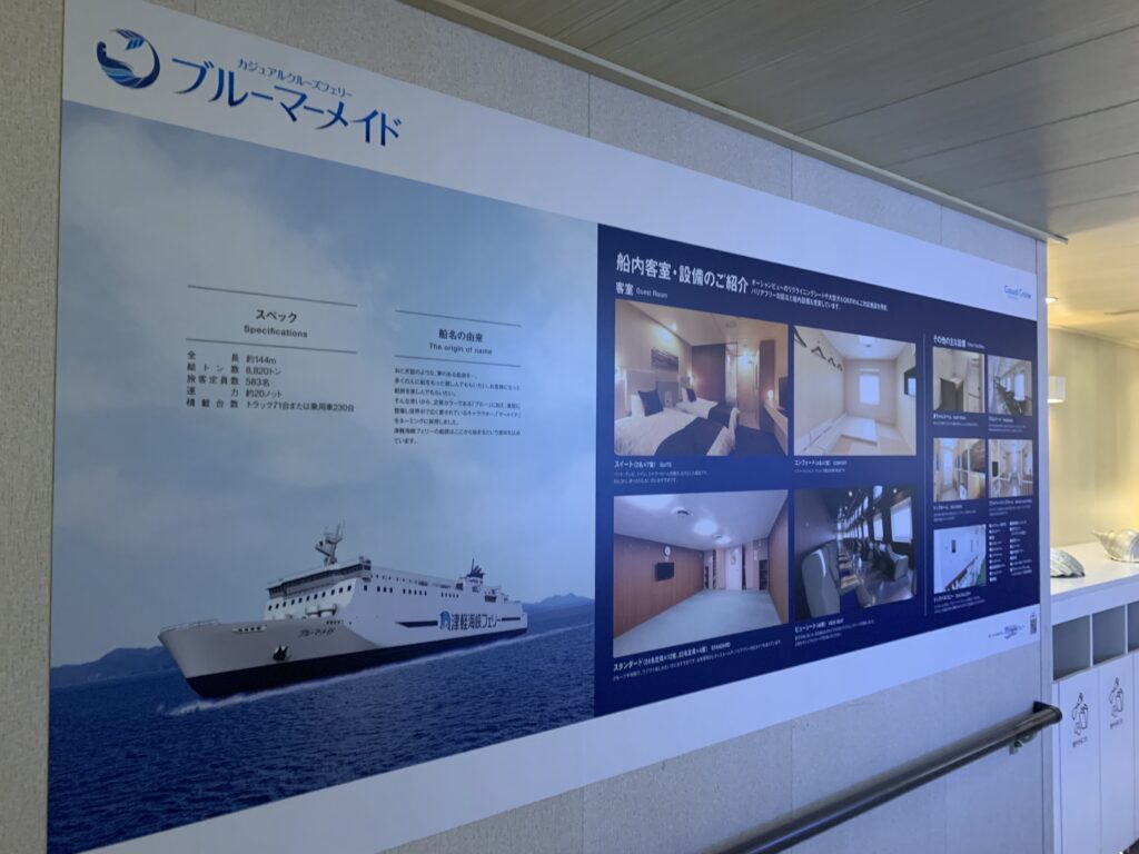 さて、今回乗船した「ブルーマーメイド」のポスターが船内に掲げられていました。客室は「スタンダード」のほか、ゆったりとリクライニングできる「ビューシート」、プライベートな空間を提供する「コンフォート」、そしてまるでホテルの一室のような豪華な「スイート」まで、さまざまなニーズに応える選択肢があります。さらに今後、客室の一部を個室化する工事が予定されており、より快適に船旅を楽しめる新たな客室が増える見込みです。船旅を愛する者にはたまらないニュースです。