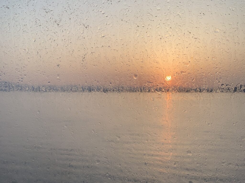 夜の間、フェリーのカーテンは閉ざされ、外の景色は見えずに過ごしていましたが、函館が近づくにつれて、ついにその幕が開きました。ちょうどその瞬間、東の空が薄明かりに染まり始め、函館の街並みの彼方から、ゆっくりと朝日が顔を出しました。海の上で迎える日の出は、静けさと壮大さを併せ持ち、私の心に深く刻まれる特別な瞬間となりました。これまで海上で日の出を迎えたことはなく、その一瞬一瞬が、まるで絵画のように美しく、感動に包まれました。