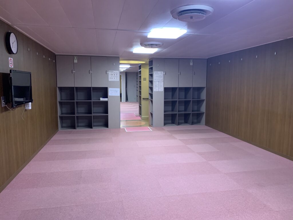 今回利用する「スタンダード」クラスは、大部屋での雑魚寝が基本です。夏休みや昼間の便ならば、他の乗客と一緒に過ごすことになりますが、今回は夜行便。部屋には私一人だけで、広いスペースを独占することができました。また、必要に応じて案内所で有料で毛布を借りることもできます。