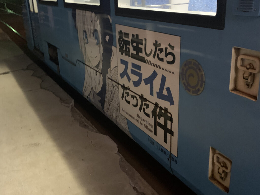 ホテルの最寄りは「函館駅前」停留所ですが、もう一つの場所に立ち寄るため、「魚市場通」停留所まで乗車しました。そこには運よく「転生したらスライムだった件」のラッピング車両が来ました。