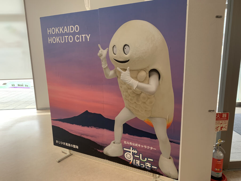 再び南口に戻り、駅に隣接する「ほっくる」というお土産屋さんに立ち寄りました。店内に入ると、北斗市の公式キャラクター「ずーしーほっきー」が出迎えてくれました。「ホッキ」という貝が名前の由来で、北斗市のいたるところで彼の姿を見かけることができるそうです。