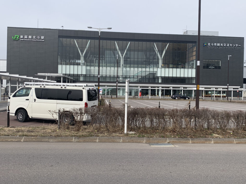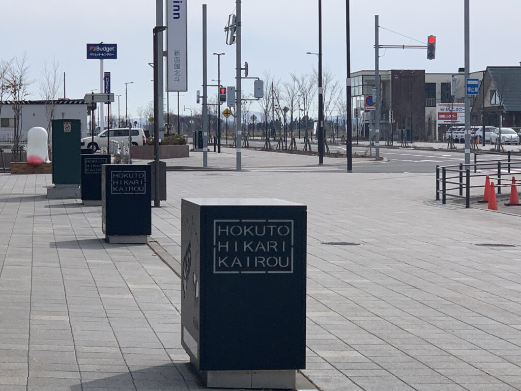 南口周辺には、レンタカー店やホテル、そして温泉施設が立地していて、活気があります。駅が位置する北斗市は、新幹線の開業に合わせて再開発が進み、道路も立派に整備されて、おしゃれな街並みが広がっていました。