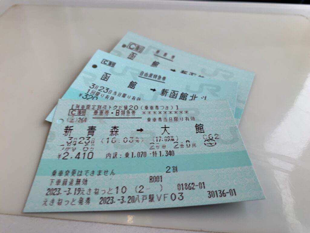 今回の旅では、以下のきっぷを利用しました。新幹線はSuicaでチケットレス乗車をしたため、ここには含まれていませんが、その他の3枚のきっぷはすべて発券が必要でした。普段は、Suicaやチケットレス乗車ができるエリアでは可能な限りその方法を利用しています。そのため、新幹線に乗るときに紙のきっぷを使うことはほとんどなくなりました。しかし、こうして紙のきっぷを並べてみると、その独特の風合いや手にしたときの感触が、旅の一部として味わい深く感じられることを改めて実感しました。