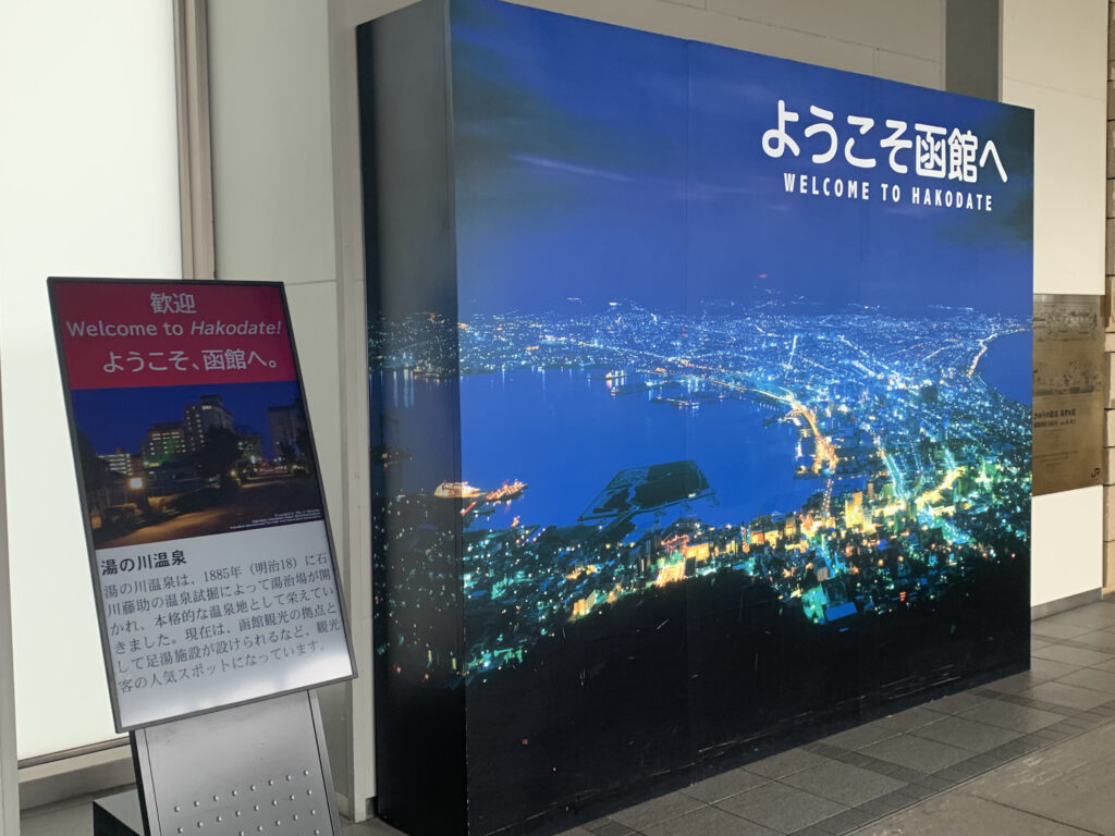 改札をくぐると「ようこそ函館へ」と書かれた美しい夜景の看板が目に飛び込んできます。