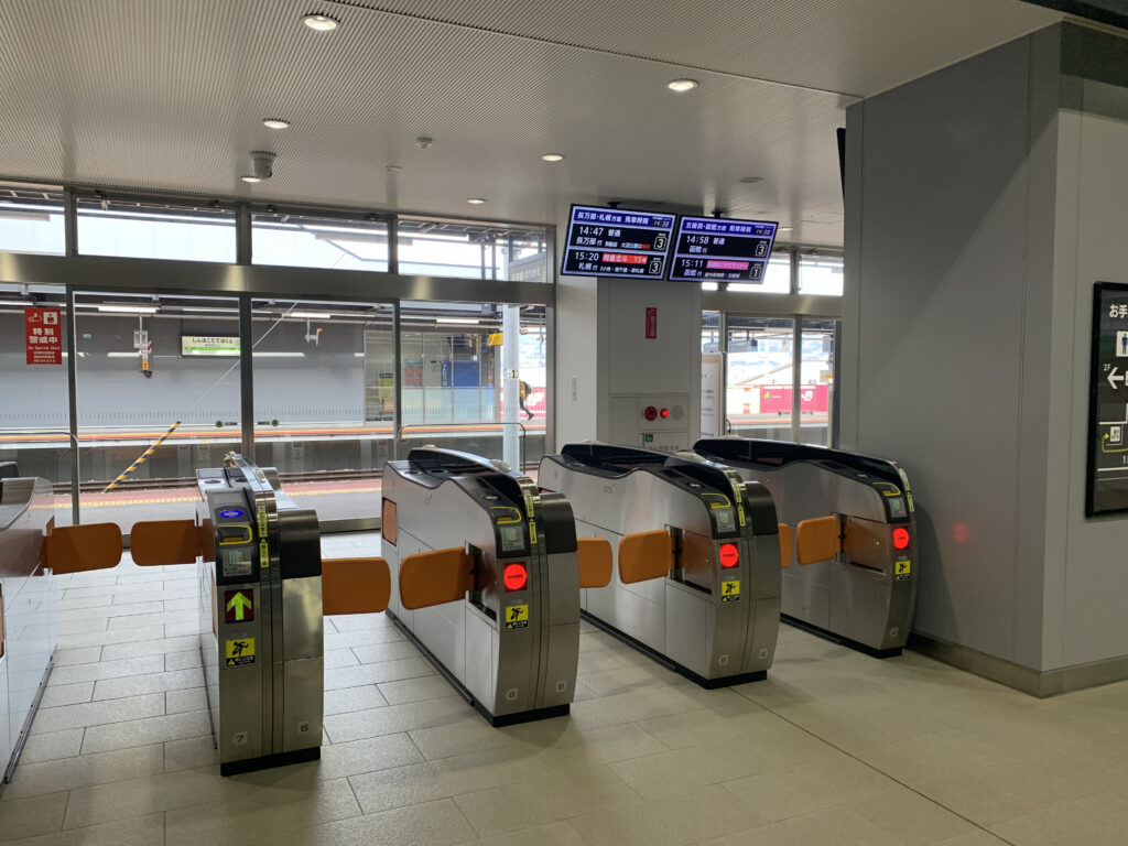 11番線側にやってきました。ここには在来線の1番線・2番線とを直接つなぐ改札口があります。この改札口を使えば、階段やエスカレーターで2階に上がることなく、スムーズに乗り換えが可能です。