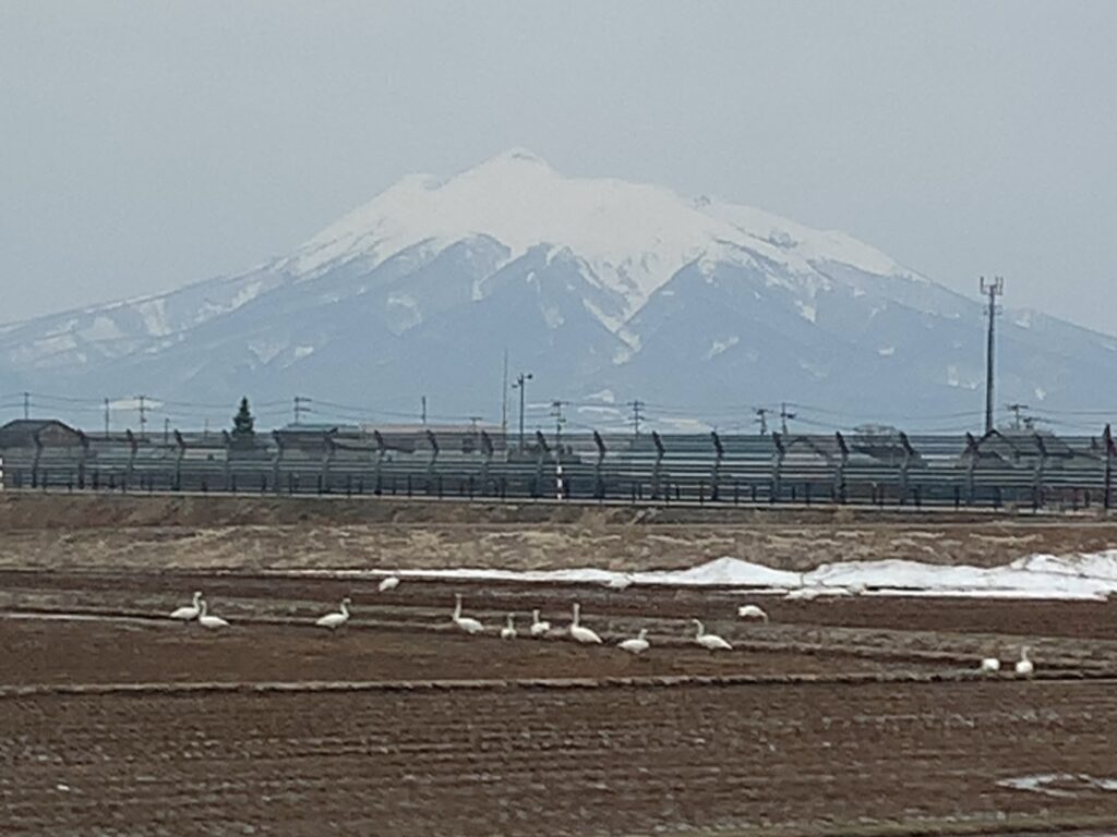 やがて、右手には津軽地方のシンボルである岩木山が姿を現します。雪をかぶったその雄大な姿と、田んぼに佇む白鳥たちが、まるで冬の絵画のような美しい景色を作り上げています。しかし、雪は少なくなっており、冬の終わりと春の訪れが同時に感じられる瞬間です。