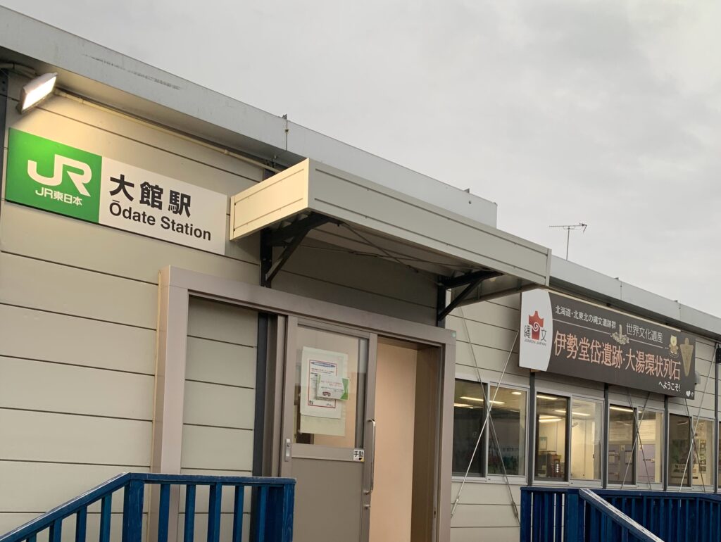 駅を出ると、大館駅は建て替え工事のため仮設の駅舎になっていました。仮設駅舎の横では、新しい駅舎の建設が進んでおり、その完成が今から待ち遠しいです。