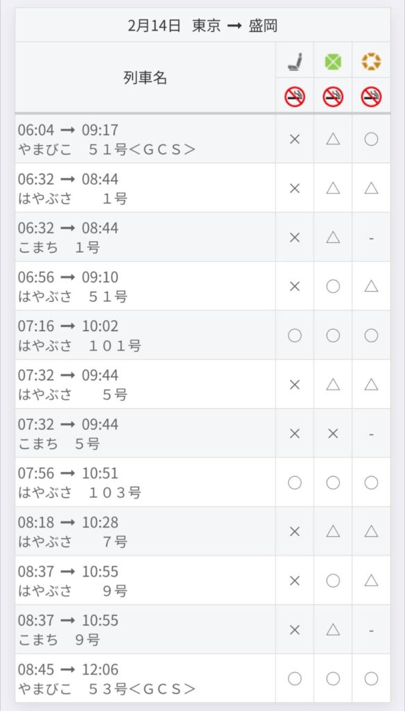 このタイプの列車は盛岡まで時間がかかりますが、快適に過ごしたいとき、グループで横並びの席を確保したいときに大いに役に立ちます。